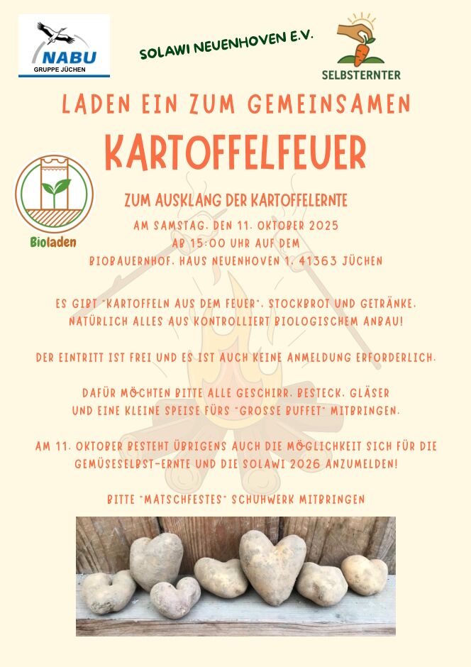 Wir laden ein zum gemeinsamen Kartoffelfeuer am Samstag, den 11. Oktober 2025 ab 15:00 Uhr auf dem Biobauernhof Essers, Haus Neuenhoven, 41363 Jüchen.